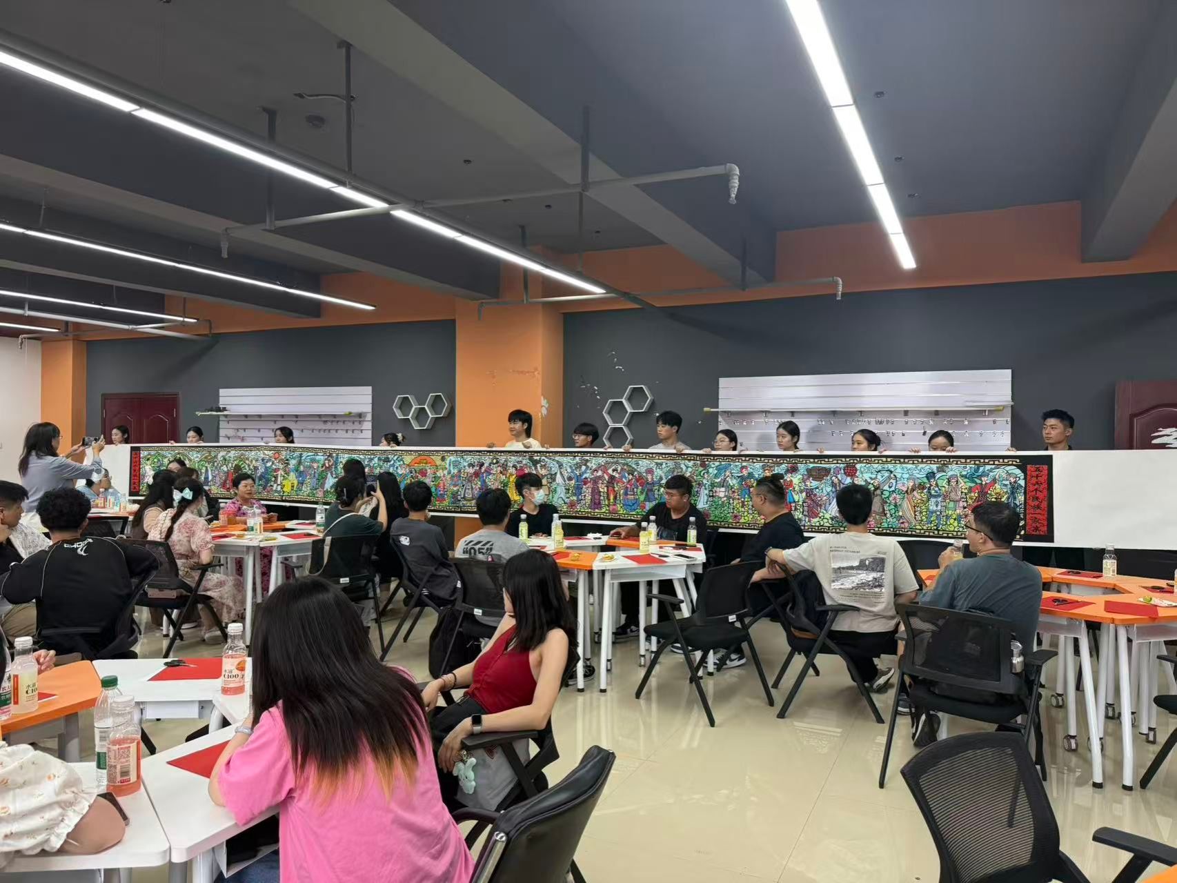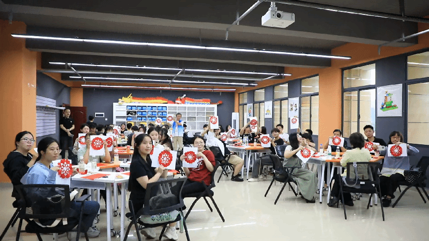随后,交流活动进入文化体验环节。在天泉楼901教室,萍乡学院教育学院唐柏林老师为两岸青年带来剪纸课程教学体验。唐柏林老师从剪纸艺术的基础技法入手,结合实例演示剪刻步骤,耐心指导大家完成简易剪纸作品。活动中,唐柏林老师特别展示了萍乡学院剪纸社团精心创作的大型剪纸作品《56个民族56枝花》,该作品总长12 米、宽0.8米,以细腻的工艺呈现各民族特色元素,生动展现剪纸艺术的独特魅力,引发台湾青年阵阵赞叹。