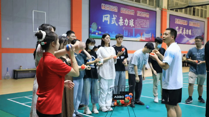 课程间隙的茶歇时间,两岸师生围坐交流,分享剪纸创作心得与校园生活趣事,现场氛围温馨融洽。下一站交流团前往体育学院,在专业教师的指导下学习太极拳与柔力球,亲身感受传统运动的韵味,在一招一式的练习中体会运动乐趣,进一步丰富交流体验。